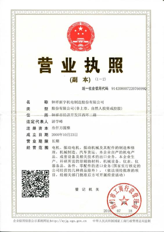 ? ? ? ?鐘祥新宇機電制造股份有限公司前身是鐘祥電機廠,1968年 籌建工廠,原機電部確認為定點生產(chǎn)中小型電機的專業(yè)廠家。于2014年09月24日由“鐘祥新宇機電制造有限公司”變更名為“鐘祥新宇機電制造股份有限公司”。主要生產(chǎn)各類振動電機、振動機械、輸送機械。是中國電器工業(yè)協(xié)會中小型電機分會理事單位、中國重型機械工業(yè)協(xié)會洗選設備專業(yè)委員會理事單位,是中國大型的振動電機生產(chǎn)廠家。